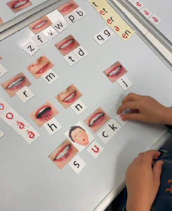 De munbilder och bokstäver som eleverna hittills tränat och som användes vid den föregående träningen, sitter alltid kvar på tavlan till nästa övningstillfälle!