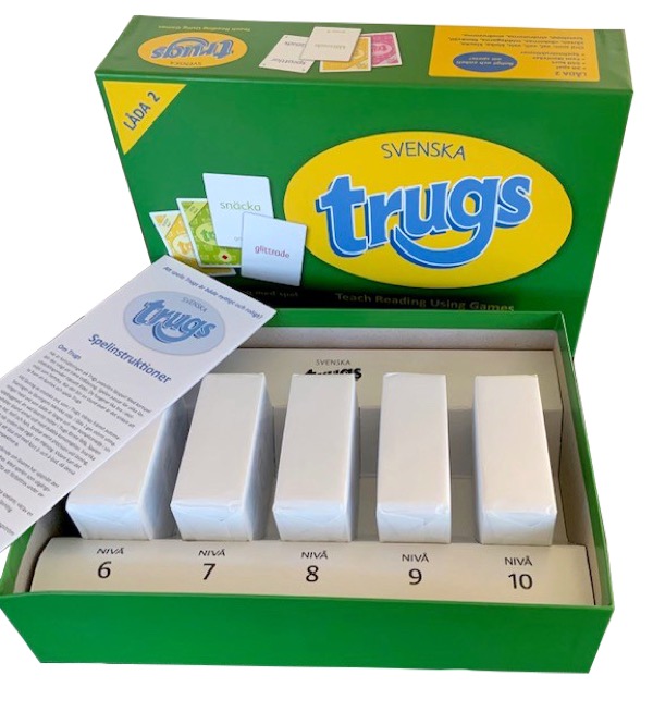 Trugs låda 2 är reviderad och innehåller 550 kort fördelade på 4 spel på 5 nivåer (6–10). Spelen känns igen från Trugs första låda men här ställs större krav på läsningen. Ett utförligt instruktionshäfte ingår.