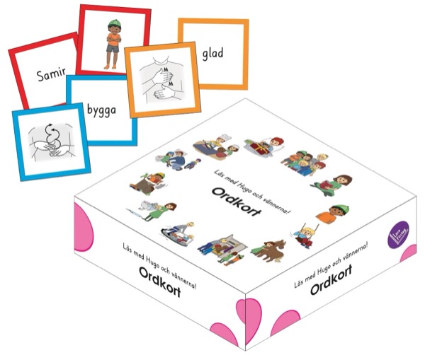 Kortlåda 2 – Läs med Hugo och vännerna! består av 471 ordkort med en ordbild på ena sidan och ordets ritade tecken på den andra sidan.