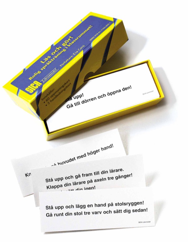 Rolig språkträning i klassrummet! Det här materialet består av kort med uppmaningar av olika svårighetsgrad. Eleverna ska läsa, förstå och utföra den uppmaning som står på ett kort. Det är ett material som ger lästräning, omväxling och tillfälle att röra sig, vilket befrämjar inlärningen.