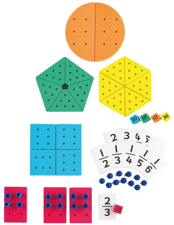 För att tex ta reda på 2/5 av 15 fördelas 15 piggar jämt över bitarna i en pentagon. Piggarna på två av dessa bitar visar svaret!
