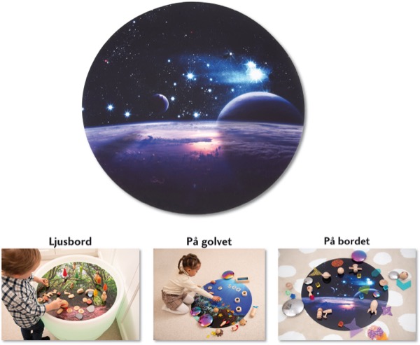 Vackert och detaljrikt galaxlandskap med planeter och stjärnor. Som gjort för fantasilek, sortering, enkel matematik mm. Möjligheterna är många.